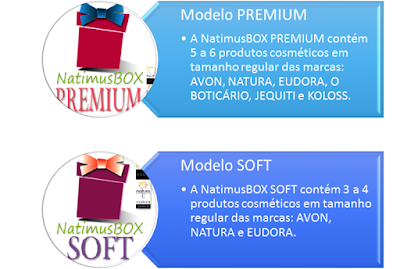 2 – NatimusBOX PREMIUM: Na caixinha PREMIUM você receberá uma seleção de 5 a 6 produtos em tamanho regular das marcas AVON, NATURA, EUDORA, JEQUITI, KOLOSS, O BOTICÁRIO e outras.
