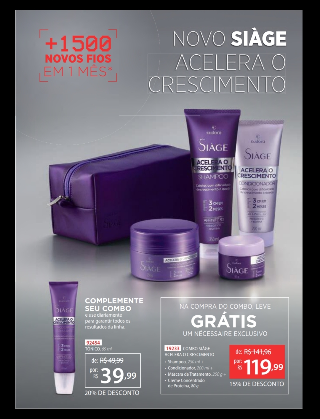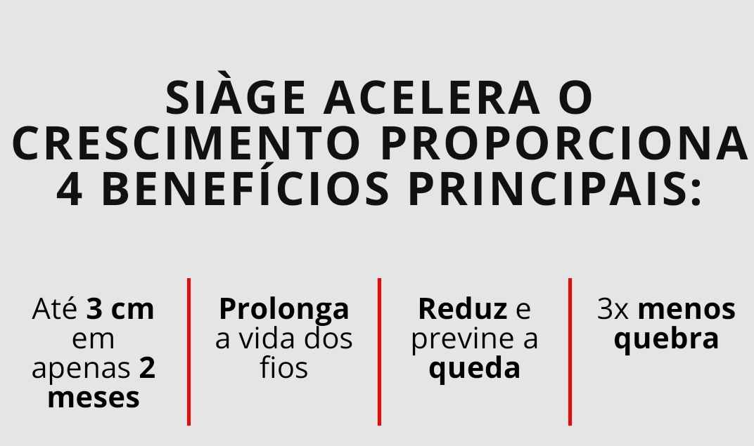 Siàge Acelera o Crescimento vem com a proposta de 5x menos pontas duplas, cabelos mais fortes, maleáveis e protegidos e +1500 novos fios em 1 mês com o uso contínuo de todos os produtos. 3 cm em dois meses com o uso combinado da linha. ??♀️ Além disso, sua formulação contém prebiótico e biotina que atuam diretamente no equilíbrio do couro cabeludo ativando o metabolismo do fio estimulando o crescimento.