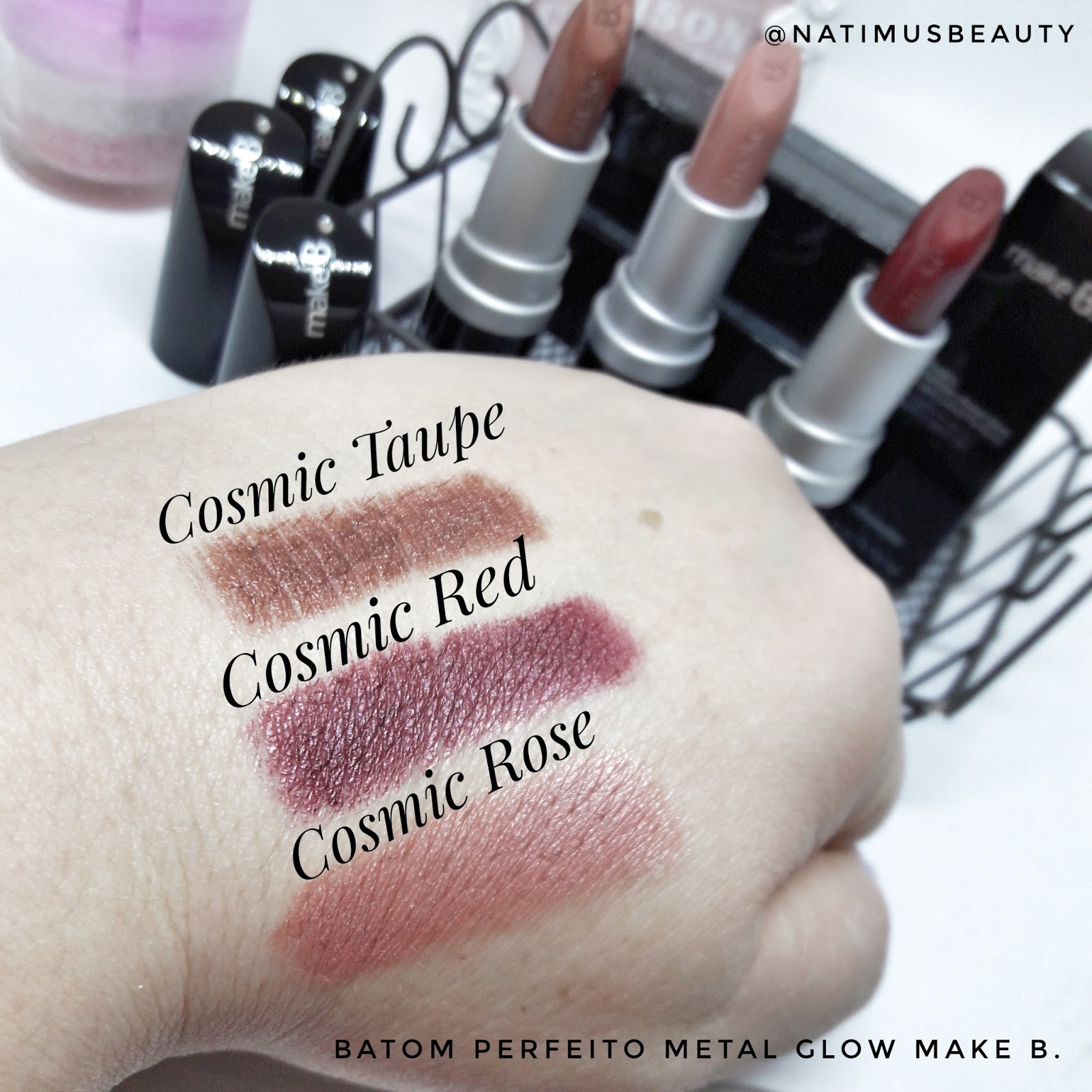 Trago aqui para vocês amostragem dos novos batons metalizados na linha Make B.  Eu testei 3 cores: Cosmic Taupe, Cosmic Red e Cosmic Rose, mas além destas cores, a coleção Batom Perfeito Metal Glow Make B. tem mais 3 cores, que são: Cosmic Brown, Cosmic Grey e Cosmic Purple